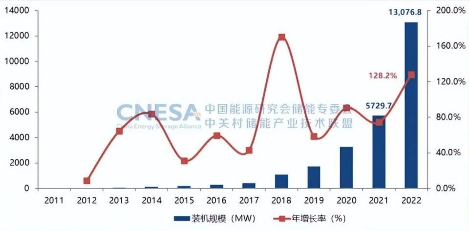 圖表 10:2020-2022年中國新型儲能市場累計裝機規(guī)?!挝唬篗W,%