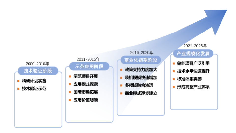 我國儲能市場大致可分為四個發(fā)展階段:一是技術(shù)驗證階段(2010年以前),主要是開展基礎(chǔ)研發(fā)和技術(shù)驗證示范;二是示范應(yīng)用階段(2011~2015年),通過示范項目開展,儲能技術(shù)性能快速提升、應(yīng)用模式不斷清晰,應(yīng)用價值被廣泛認(rèn)可,這個時期的儲能裝機以傳統(tǒng)的抽水蓄能為主;三是商業(yè)化初期(2016~2020年),隨著政策支持力度加大、市場機制逐漸理順、多領(lǐng)域融合滲透,儲能裝機規(guī)??焖僭黾?、商業(yè)模式逐漸建立;四是產(chǎn)業(yè)規(guī)?;l(fā)展階段(2021~2025年),儲能產(chǎn)業(yè)進入從產(chǎn)業(yè)化初期向規(guī)?;l(fā)展的過渡階段,隨著國家“雙碳”政策提出,儲能規(guī)模獲得了快速增長,儲能項目廣泛應(yīng)用、技術(shù)水平快速提升、標(biāo)準(zhǔn)體系日趨完善,形成較為完整的產(chǎn)業(yè)體系和一批有國際競爭力的市場主體,儲能成為能源領(lǐng)域經(jīng)濟新增長點。2022年2月,國家發(fā)展改革委、國家能源局印發(fā)的《“十四五”新型儲能發(fā)展實施方案》(以下簡稱“《實施方案》”)提出,到2025年,新型儲能由商業(yè)化初期步入規(guī)?;l(fā)展階段,具備大規(guī)模商業(yè)化應(yīng)用條件,有望2030年前后實現(xiàn)全面市場化。其中,新型儲能是指除抽水蓄能以外的新型儲能技術(shù),包括新型鋰離子電池、液流電池、飛輪、壓縮空氣、氫(氨)儲能、熱(冷)儲能等。