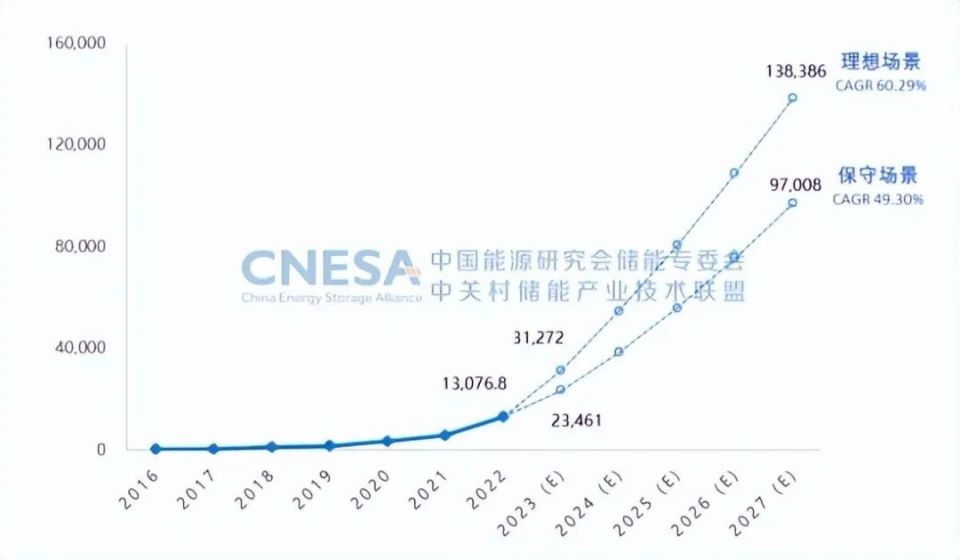 經(jīng)歷“十三五”孕育,“十四五”時期,我國新型儲能市場有望邁上新臺階。2021開始,我國新型儲能從商業(yè)化初期向規(guī)模化發(fā)展,根據(jù)CNESA預(yù)測,在未來5年,“新能源+儲能”是新型儲能的主要應(yīng)用場景,政策推動將構(gòu)成中國儲能市場的主要增長動力;根據(jù)中國能源研究會儲能專委會/中關(guān)村儲能產(chǎn)業(yè)技術(shù)聯(lián)盟(CNESA)全球儲能數(shù)據(jù)庫的不完全統(tǒng)計,截至2022年底,國內(nèi)已投運的電力儲能項目累計裝機達59.8GW,占全球市場總規(guī)模的25%,年增長率38%,其中新型儲能持續(xù)高速發(fā)展,累計裝機規(guī)模首次突破10GW,累計裝機規(guī)模首次突破10GW,達到13.1GW/27.1GWh。未來5年,“新能源+儲能”是新型儲能的主要應(yīng)用場景,政策推動是主要增長動力;根據(jù)中關(guān)村儲能產(chǎn)業(yè)技術(shù)聯(lián)盟(CNESA)對我國新型儲能未來5年市場規(guī)模的預(yù)測,保守場景下,預(yù)計2027年新型儲能累計規(guī)模將達到97.0GW,2023-2027年復(fù)合年均增長率(CAGR)為49.3%;理想場景下,預(yù)計2027年新型儲能累計規(guī)模將達到138.4GW,2023-2027年復(fù)合年均增長率(CAGR)為60.3%。預(yù)計未來5年,年度新增儲能裝機呈平穩(wěn)上升趨勢。保守場景下,年平均新增儲能裝機為16.8GW;理想場景下,年平均新增儲能裝機為25.1GW。