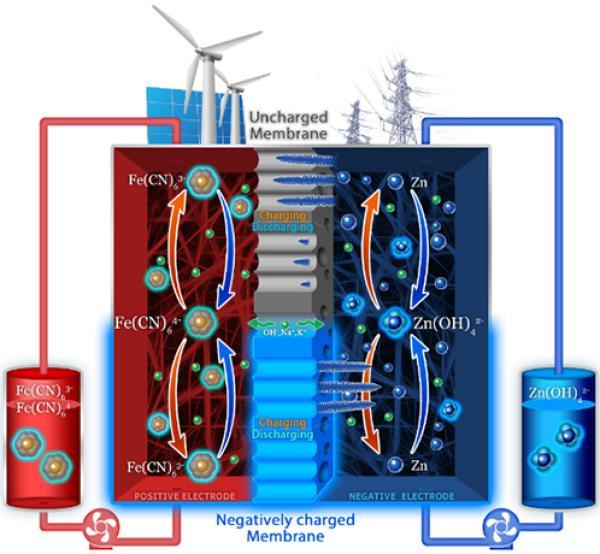 鋅鐵液流電池選用礦藏儲(chǔ)量豐富且價(jià)格穩(wěn)定的鋅、鐵元素組成配對(duì),依靠鋅酸鹽離子和鐵離子之間的電化學(xué)反應(yīng)來實(shí)現(xiàn)電能的儲(chǔ)存和釋放,采用堿性電解液,擁有零爆炸零燃燒的特性,電池放電次數(shù)超過20000次,使用壽命超過20年,在額定功率輸出下,放電時(shí)長(zhǎng)超過8小時(shí)。