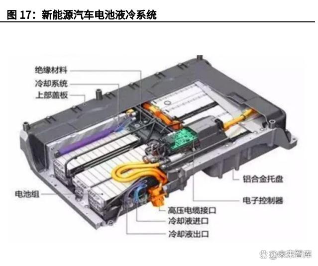 液冷系統(tǒng)的核心是液冷板和定制化流道設計。液冷系統(tǒng)一般由液冷板、液冷 機組(加熱器選配)、液冷管路、高低壓線束、冷卻液等組成。其中,液冷板的 結構直接影響換熱效果,是最關鍵的零部件之一。同時,為避免電池包溫度分 布不均勻,需控制不同流道內(nèi)的流量分布保持均勻,在一定范圍內(nèi)增加流速會 提升散熱效率,但當達到一定值時會使管路內(nèi)壓降增大,增大能耗,因此需要 結合實際情況進行定制化流道設計。目前這一領域的代表企業(yè)有英維克、同飛 股份、奧特佳等。