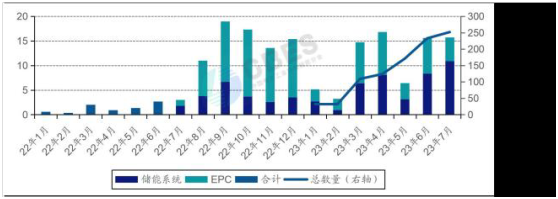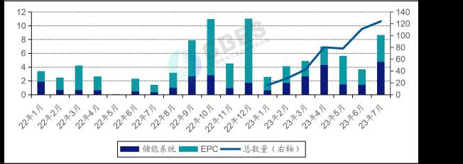 中國電池工業(yè)協(xié)會儲能分會近日發(fā)布的2023中國新型儲能7月研究簡報(bào)顯示,儲能市場持續(xù)火熱,7 月儲能系統(tǒng)招標(biāo)規(guī)模創(chuàng)歷史新高。分會共統(tǒng)計(jì)到儲能招標(biāo)項(xiàng)目252個(gè),總規(guī)模達(dá)到15.8GWh ,環(huán)比增長1% ,同比增長425% 。其中,儲能EPC項(xiàng)目共計(jì)171個(gè),規(guī)模為4.9GWh ,儲能系統(tǒng)項(xiàng)目共計(jì)81個(gè),規(guī)模為10.9GWh。