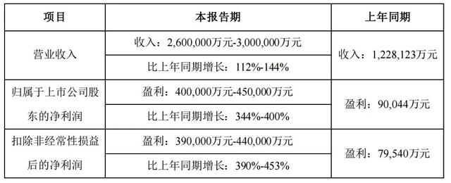 此外,最受關(guān)注的是其凈利潤的數(shù)據(jù),預(yù)計實現(xiàn)40-45億,同比增長344%-400%,而扣非凈利增幅更甚,同增更是高達(dá)390%-453%。