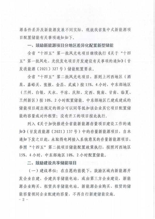 “十四五”第二批風(fēng)光電項(xiàng)目:河西地區(qū)(酒泉、嘉峪關(guān)、張掖、金昌、武威)配置儲能為15%,連續(xù)時(shí)長4小時(shí);中東部地區(qū)(蘭州、白銀、天水、平?jīng)?、慶陽、定西、隴南、甘南、臨夏、蘭州新區(qū))配置儲能為10%,連續(xù)時(shí)長2小時(shí)。