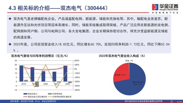 雙杰電氣是老牌輸配電企業(yè),產(chǎn)品涵蓋配電網(wǎng)、新能源、儲(chǔ)能和充換電等。其中,輸配電業(yè)務(wù)復(fù)蘇,新能源升壓站和光伏項(xiàng)目等迎來(lái)高增長(zhǎng)。同時(shí),儲(chǔ)能系統(tǒng)集成取得突破,產(chǎn)品廣泛應(yīng)用在新能源的發(fā)電側(cè)、配網(wǎng)測(cè)和用戶側(cè)。公司與電網(wǎng)公司、各大發(fā)電集團(tuán)、企業(yè)長(zhǎng)期保持密切合作,將充分受益新能源及儲(chǔ)能的高速發(fā)展。2022年度,公司實(shí)現(xiàn)營(yíng)業(yè)收入18.82億元,同比增長(zhǎng)60.70%,實(shí)現(xiàn)歸母凈利潤(rùn)-1.72億元,同比下降52.04% 。