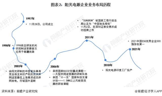 1997年11月28日,陽(yáng)光電源成立;2003年,企業(yè)自主研發(fā)的中國(guó)首臺(tái)具有完全知識(shí)產(chǎn)權(quán)的光伏并網(wǎng)逆變器在上海奉賢成功并網(wǎng)發(fā)電,并打破國(guó)外壟斷;2011年11月,企業(yè)在深圳證券交易所成功掛牌上市;2018年,陽(yáng)光電源的印度陽(yáng)光電源印度工廠投產(chǎn)。