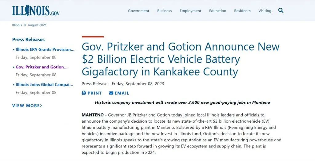 本月初,美國伊利諾伊州政府官網(wǎng)曾發(fā)布消息,宣布國軒高科將斥資20億美元(約147億元人民幣)在該州坎卡基縣曼特諾新建電動汽車電池超級工廠。