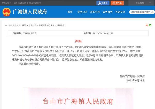 臺(tái)山市廣海鎮(zhèn)人民政府在2022年6月28日發(fā)布的一則聲明顯示:珠??苿?chuàng)電力電子有限公司(目前已更名為“珠??苿?chuàng)儲(chǔ)能科技有限公司”)利用廣海鎮(zhèn)人民政府經(jīng)濟(jì)發(fā)展辦公室備案系統(tǒng)的漏洞,未經(jīng)備案項(xiàng)目落戶地塊權(quán)屬人同意,虛假備案28億的廣東省江門(mén)市臺(tái)山市廣海鎮(zhèn)500MW/1000MWh集中式儲(chǔ)能電站項(xiàng)目。聲明稱,該鎮(zhèn)已于2022年6月28日撤銷該備案。