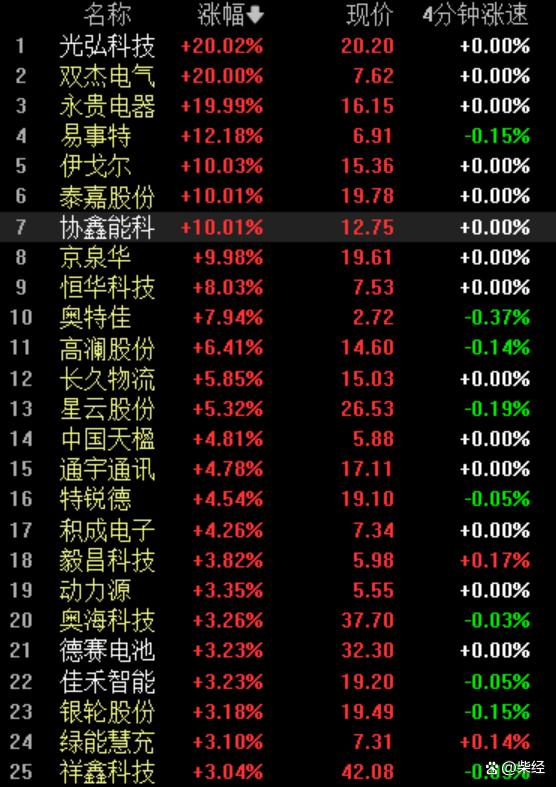 從個(gè)股來(lái)看,光弘科技(300735.SZ)、雙杰電氣(300444.SZ)、永貴電器(300351.SZ)、易事特(300376.SZ)、伊戈?duì)?002922.SZ)、泰嘉股份(002843.SZ)、協(xié)鑫能科(002015.SZ)等近十個(gè)股票相繼漲停。