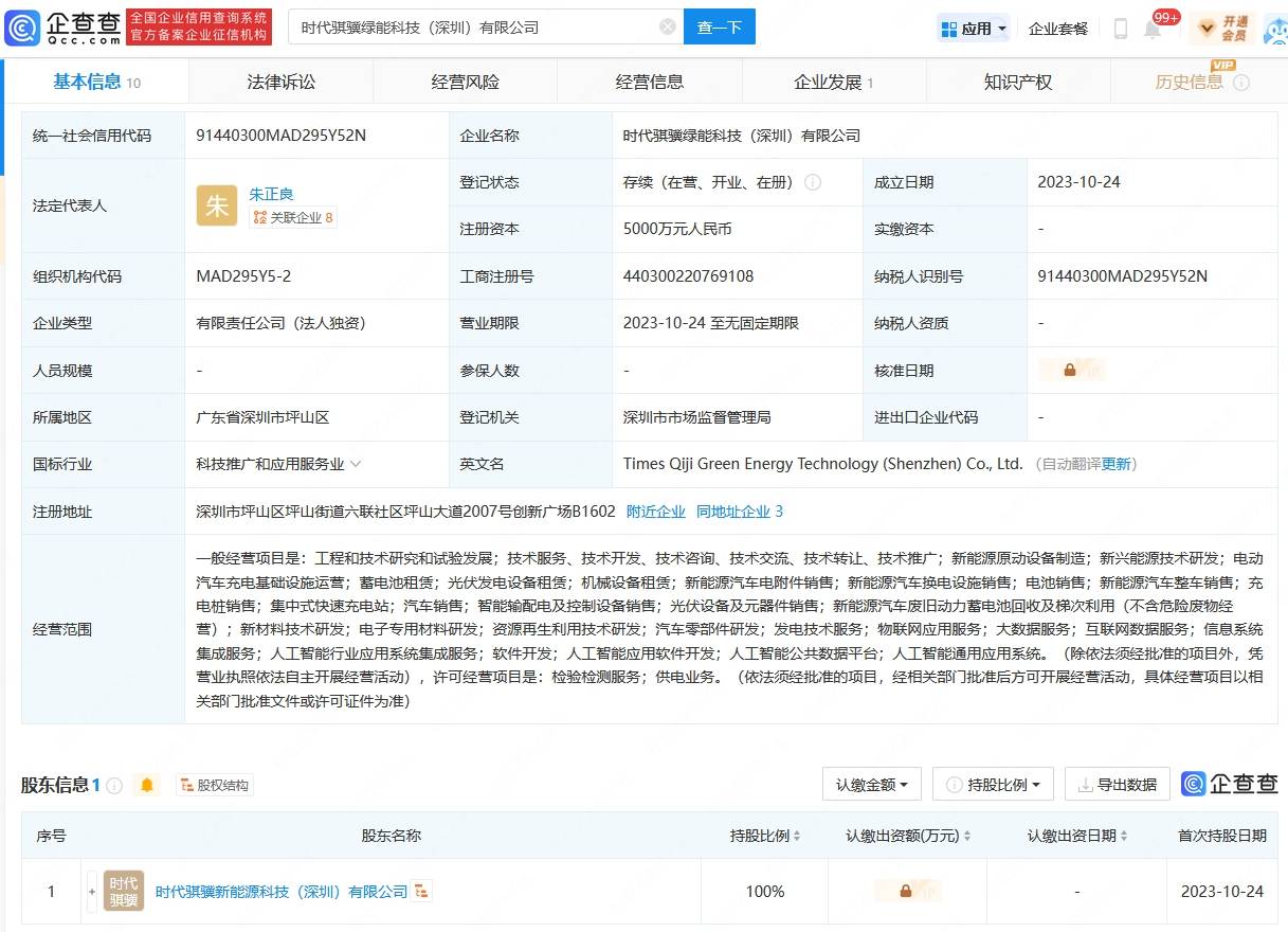 近日,時(shí)代騏驥綠能科技(深圳)有限公司成立,法定代表人為朱正良,注冊資本5000萬元人民幣,經(jīng)營范圍包含:新能源原動(dòng)設(shè)備制造、電動(dòng)汽車充電基礎(chǔ)設(shè)施運(yùn)營、光伏發(fā)電設(shè)備租賃、人工智能行業(yè)應(yīng)用系統(tǒng)集成服務(wù)等。