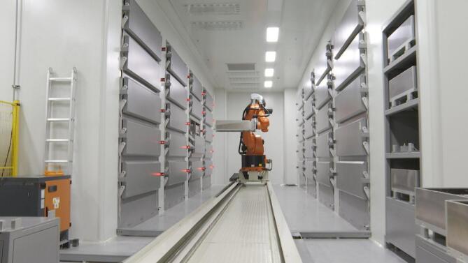 在干燥車間內(nèi),六軸機器人正在搬運電池