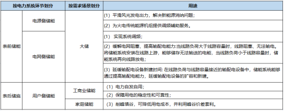 目前,儲能技術主要應用于電力系統(tǒng)。具體而言,可以將儲能技術在電力系統(tǒng)中的典型應用場景劃分為電源側、電網側和用戶側三個方面。其中電源側、電網側儲能又稱為表前儲能或大儲,用戶側儲能又稱為表后儲能。用戶側儲能分為工商業(yè)儲能與戶儲,兩者區(qū)別在于客戶群體。