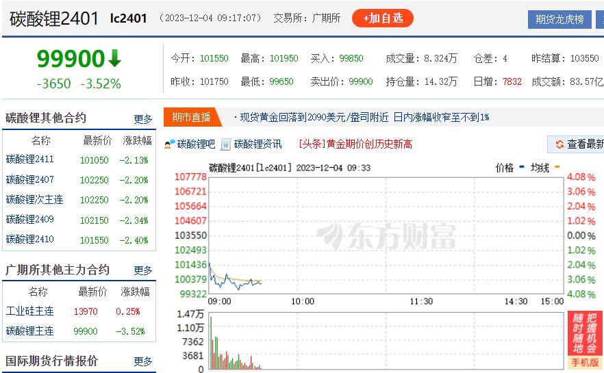 2023年12月4日,碳酸鋰盤中跌破10萬(wàn)元/噸