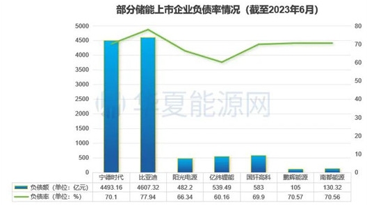 華夏能源網(wǎng)注意到,在不切實(shí)際的瘋狂擴(kuò)充下,高負(fù)債已成儲(chǔ)能行業(yè)常態(tài),行業(yè)龍頭也不例外。數(shù)據(jù)顯示,截至今年6月底,比亞迪(SZ:002594)、鵬輝能源、南都電源(SZ:300068)、寧德時(shí)代(SZ:300750)的負(fù)債率均超過了70%;國(guó)軒高科(SZ:002074)、陽光電源(SZ:300274)也超過60%。