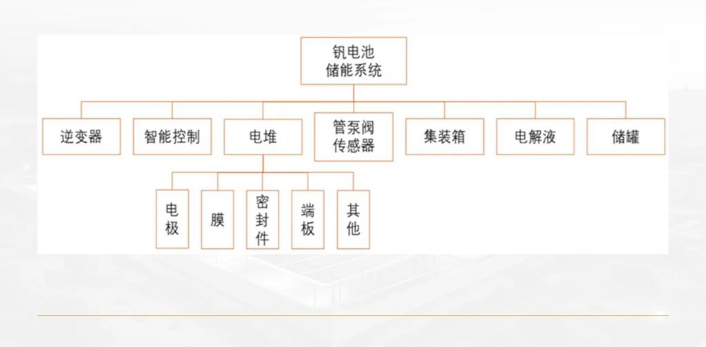 以釩液流電池為例,整個(gè)釩電池儲(chǔ)能系統(tǒng)主要由電堆、電解液、逆變器、智能控制、儲(chǔ)罐、集裝箱、管泵閥傳感器幾部分構(gòu)成。