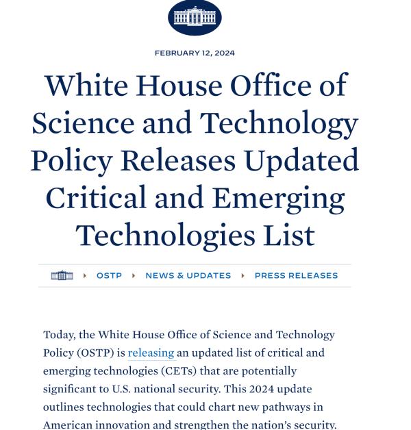據(jù)介紹,2024版美國關(guān)鍵和新興技術(shù)清單是由白宮科技政策辦公室(OSTP)、國家科學技術(shù)委員會(NSTC)和國家安全委員會(NSC)共同牽頭組建的“關(guān)鍵和新興技術(shù)快速行動”小組委員會在兩年時間里通過跨部門聯(lián)合研究形成。
