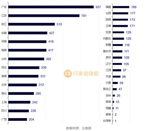 分區(qū)域來看,新增儲能企業(yè)主要分布在廣東、江蘇、浙江等地。