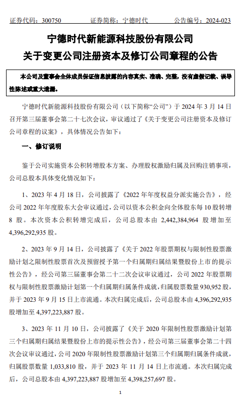 近日,寧德時(shí)代發(fā)布《關(guān)于變更公司注冊資本及修訂公司章程的公告》。