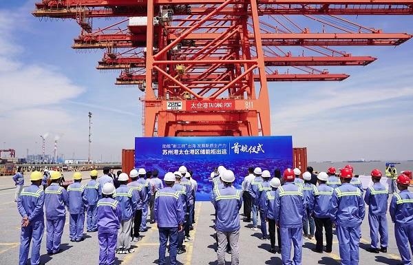 圖說(shuō):蘇州港太倉(cāng)港區(qū)儲(chǔ)能柜出運(yùn)首航儀式。太倉(cāng)市委宣傳部 供圖
