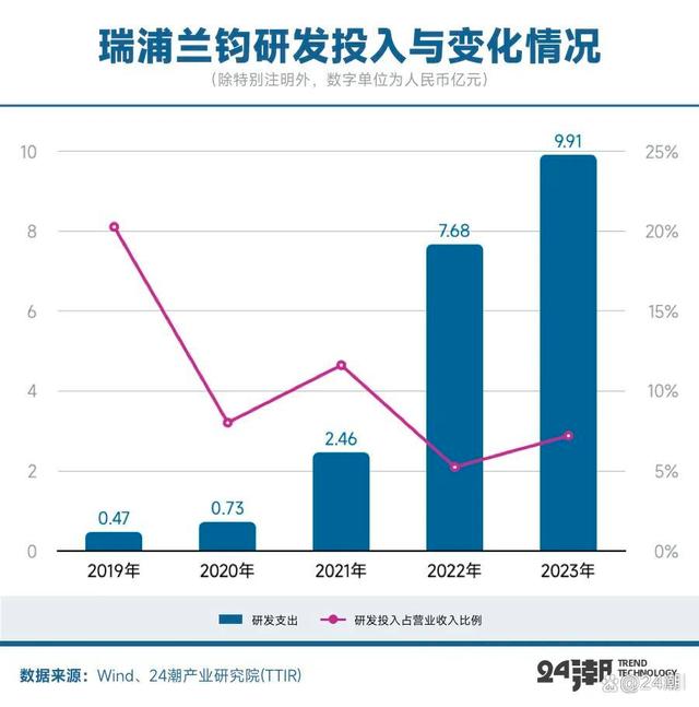 而瑞浦蘭鈞的技術(shù)突破與持續(xù)且強(qiáng)力的研發(fā)投入有很大關(guān)系。24潮產(chǎn)業(yè)研究院(TTIR)分析發(fā)現(xiàn),近幾年瑞浦蘭鈞研發(fā)投入一直保持增長(zhǎng)趨勢(shì),2023年其研發(fā)支出為9.91億元,同比增長(zhǎng)了29.04%,研發(fā)投入占營(yíng)業(yè)收入比例由2022年的5.24%提升至2023年的7.20%。