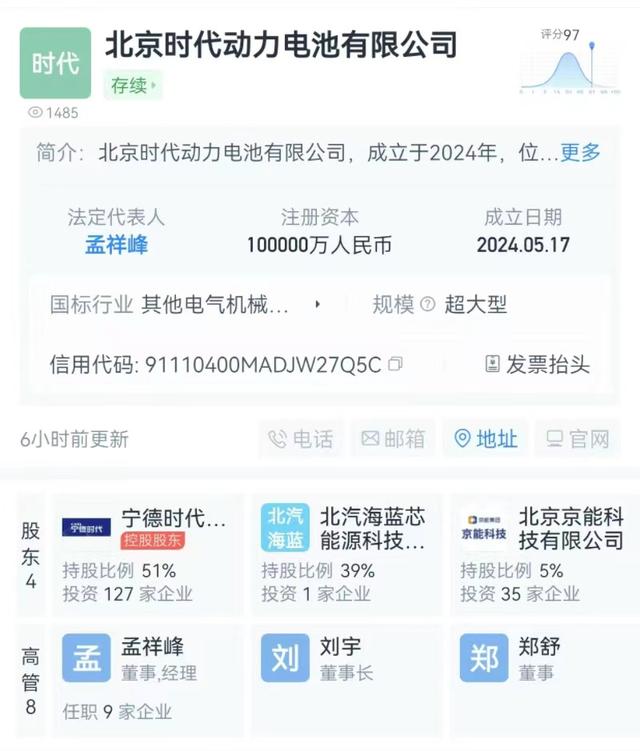 《中國(guó)經(jīng)營(yíng)報(bào)》記者在天眼查上看到,5月17日,北京時(shí)代動(dòng)力電池有限公司成立,法定代表人為孟祥峰,注冊(cè)資本10億元人民幣,是一家以從事電氣機(jī)械和器材制造業(yè)為主的企業(yè)。股東信息顯示,該公司由寧德時(shí)代、小米汽車(chē)科技有限公司、北汽海藍(lán)芯能源科技(北京)有限公司、北京京能科技有限公司共同持股。