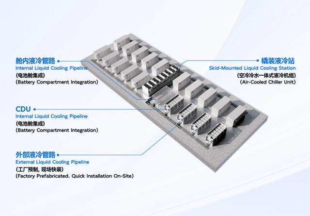 該系統(tǒng)由集中布置的液冷站、布置于電池艙內(nèi)的配水動(dòng)力站(CDU) 、電池艙內(nèi)外液冷管路,以及TMS智控系統(tǒng)組成,其具有空冷冷水一體式液冷機(jī)組和均衡智控 TMS 兩項(xiàng)節(jié)能關(guān)鍵技術(shù):首先是集中式液冷機(jī)組相比分布式液冷機(jī)組全年能效比提高113%,全年節(jié)省能耗大于50%。其次是均衡智控TMS基于負(fù)荷實(shí)時(shí)預(yù)測、CPC均衡模型等,可精準(zhǔn)預(yù)測電池系統(tǒng)溫控目標(biāo)曲線,實(shí)現(xiàn)電芯均衡冷卻,可使液冷系統(tǒng)冷卻能力輸出峰值降低35%以上,帶來液冷站配置規(guī)??蓽p小35%或節(jié)能45%,相比于分布式電池艙液冷系統(tǒng)節(jié)能效果顯著,在儲能液冷、數(shù)據(jù)中心液冷等領(lǐng)域都具備良好的應(yīng)用前景。