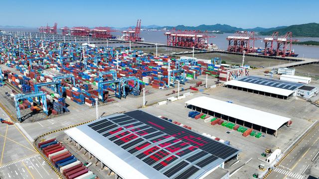 炎炎夏日,寧波舟山港梅山港區(qū)“綠意”正盎然:百米風機悠然轉動,清潔能源設備高效運行,岸電設施源源不斷地為集裝箱貨輪提供電能,搭載太陽能光伏發(fā)電系統(tǒng)的10臺遠控橋吊有序作業(yè)……綠色碼頭初具雛形。