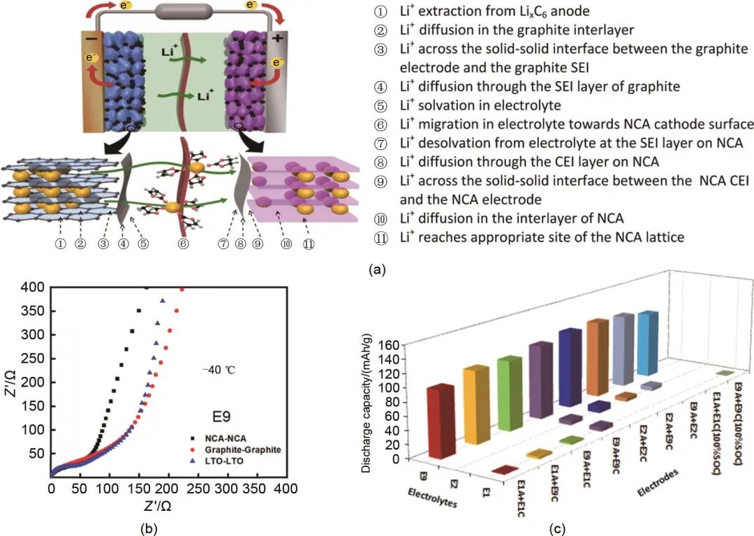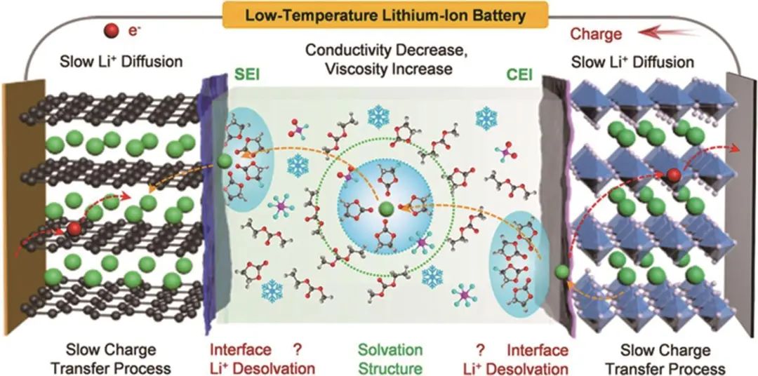 鋰電池低溫性能衰退的原因機(jī)理如圖2所示,主要是:①低溫下電解液的電導(dǎo)率下降,黏度上升,阻礙了Li+在電解液內(nèi)的遷移;②Li+在負(fù)極(例如石墨、硅、鋰金屬)或正極(例如LiNixMnyCo1-x-yO2)中的擴(kuò)散系數(shù)在低溫下下降,導(dǎo)致從電極擴(kuò)散到電解液內(nèi)的Li+減少;③低溫下電荷轉(zhuǎn)移過程更加困難,電荷轉(zhuǎn)移電阻(Rct)顯著提高,并且Li+在SEI和CEI內(nèi)的擴(kuò)散系數(shù)下降。這三個原因分別從主體電解液中遷移、電極內(nèi)部擴(kuò)散以及界面電荷轉(zhuǎn)移三個方面阻礙了鋰電池的正常運(yùn)行,造成了電池極化效應(yīng)的增大,從而降低了電池的放電容量和循環(huán)性能。