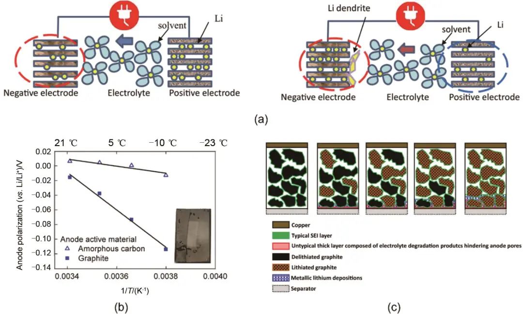 圖3 低溫對石墨負(fù)極的影響:(a) 低溫下石墨負(fù)極表面發(fā)生鋰沉積的示意圖;