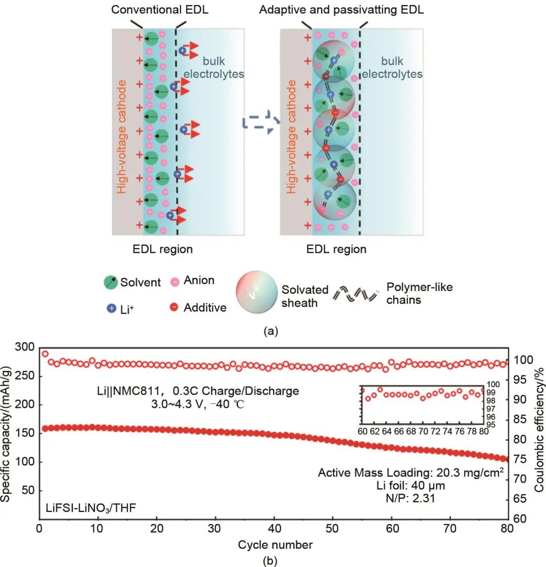 電池中的電極反應(yīng)都是在電極-電解質(zhì)界面發(fā)生的,調(diào)控鋰離子在電極-電解質(zhì)界面處的溶劑化結(jié)構(gòu)和電荷轉(zhuǎn)移行為,加快鋰離子在界面處的離子傳輸和去溶劑化過程,有助于電池實(shí)現(xiàn)在低溫下高效穩(wěn)定運(yùn)行。Zhang等提出了一種加入“刺激響應(yīng)型”添加劑的在正極/電解液界面構(gòu)建了動態(tài)高穩(wěn)定雙電層的界面溶劑化結(jié)構(gòu)調(diào)控策略。作者篩選了一系列離子尺寸小且與鋰離子具有強(qiáng)結(jié)合能力的陰離子作為“刺激響應(yīng)型”添加劑(例如NO3-、ClO4-、Br-等),如圖11(a)所示,添加劑陰離子在電池充電時(shí),可在電壓驅(qū)動下快速遷移到正極界面,添加劑陰離子與鋰離子間的強(qiáng)相互作用使得在正極界面雙電層中形成了特殊的“超分子動態(tài)網(wǎng)絡(luò)結(jié)構(gòu)”。在此動態(tài)網(wǎng)絡(luò)結(jié)構(gòu)中,添加劑吸引豐富的鋰離子,促進(jìn)鋰離子在界面處的遷移和從主體電解液中脫去溶劑,并且雙電層處于“富鋰離子-貧電解液”狀態(tài),其內(nèi)部所有的溶劑分子都參與鋰離子溶劑化,降低了雙電層內(nèi)溶劑的HOMO能級,將不穩(wěn)定的“自由溶劑”排除出雙電層,顯著提升了正極界面上溶劑的氧化穩(wěn)定性。通過這樣巧妙的電極/電解液界面設(shè)計(jì)實(shí)現(xiàn)了本體醚基電解液和界面電解液的解耦,憑借本體電解液的高離子導(dǎo)電性和界面處快速的電荷轉(zhuǎn)移機(jī)制實(shí)現(xiàn)了優(yōu)異的低溫性能。相較于常規(guī)電解液在0 ℃以下迅速下降的低溫性能,添加劑輔助的醚類電解液實(shí)現(xiàn)了Li/NMC全電池在-40 ℃下的穩(wěn)定充放電循環(huán)[圖11(b)]。這種利用特殊界面化學(xué)來優(yōu)化電解液低溫性能的方式在后期被廣泛關(guān)注,研究人員進(jìn)一步豐富了具有界面調(diào)控功能的添加劑類型并對吸附性添加劑在界面的作用機(jī)理進(jìn)行了補(bǔ)充探究。