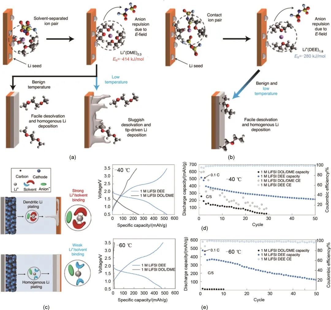 傳統(tǒng)低溫電解液研究大多是針對LIBs,但是因?yàn)槭?fù)極對EC的依賴性和其低溫工作范圍很難降低到-40 ℃以下,所以其實(shí)際應(yīng)用受到了限制。同時(shí)值得注意的是傳統(tǒng)低溫電解液研究大多是針對低溫放電容量性能的提升,對于其低溫充電和低溫循環(huán)性能的研究很少,少數(shù)涉及循環(huán)性能的研究也都是采用室溫充電、低溫放電的循環(huán)模式。這主要是因?yàn)長IBs在低溫充電過程中石墨負(fù)極會發(fā)生鋰沉積,嚴(yán)重限制鋰離子在負(fù)極中的擴(kuò)散和電池整體的安全性,從而導(dǎo)致其低溫充電性能遠(yuǎn)遠(yuǎn)不如低溫放電性能。石墨負(fù)極在低溫下的種種限制,使其成為了LIBs低溫性能難以進(jìn)一步提升的根本原因。近幾年在不斷追求更高能量密度的儲能裝置的社會背景下,以鋰金屬電池為代表的下一代鋰電池獲得了廣泛的關(guān)注。LMBs相較于LIBs有明顯更高的能量密度,且由于不再使用石墨負(fù)極,其電解液不再嚴(yán)格需要一定含量的EC,轉(zhuǎn)而可以使用醚類等具有更好低溫性能的電解液組分,使得在探尋LMBs低溫電解液時(shí)有更多的可能性。但是由于低溫下受阻的離子傳輸和過大的極化效應(yīng),使得鋰金屬負(fù)極更容易發(fā)生不均勻的鋰金屬沉積導(dǎo)致嚴(yán)重的鋰枝晶生長,在研究LMBs低溫電解液時(shí)電池的安全性需要更加重視。同時(shí),隨著能源市場的技術(shù)要求不斷升級,低溫電池的性能探索也不再局限于提升單次低溫放電的容量保持率,研究人員希望通過對電池電解液的設(shè)計(jì)來實(shí)現(xiàn)低溫環(huán)境下的高效穩(wěn)定循環(huán)??偟膩砜?,新型低溫鋰電池電解液設(shè)計(jì)更加聚焦于鋰金屬電池電解液,希望對充放電過程中鋰離子遷移機(jī)理進(jìn)行優(yōu)化,從根本上理解鋰電池的低溫性能提升方法,實(shí)現(xiàn)鋰電池的長壽命高效低溫充放電循環(huán)。