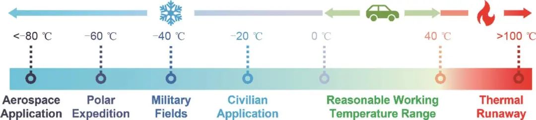 除了對能量密度的要求外,對鋰電池在特殊環(huán)境下的使用性能要求也越來越高。近年來,鋰電池在低溫環(huán)境下的性能受到了廣泛的關(guān)注。圖1展示了應(yīng)用于不同領(lǐng)域的鋰電池所需的有效工作溫度范圍,在寒冷的季節(jié)或嚴(yán)寒地區(qū),消費(fèi)電子或電動汽車上的民用鋰電池需要適應(yīng)接近-20 ℃的低溫并要求進(jìn)行穩(wěn)定的電池充放電,而使用在軍事或航空航天領(lǐng)域的電化學(xué)儲能系統(tǒng)的使用環(huán)境溫度甚至低于-60 ℃,但是目前普遍商業(yè)化使用的碳酸酯基電解液在-20 ℃時(shí)會發(fā)生電導(dǎo)率下降、黏度上升,甚至凝固等現(xiàn)象,引發(fā)電池嚴(yán)重的容量衰退、壽命減短和充電困難,這限制了現(xiàn)有鋰離子電池在低溫條件下的使用。因此如何抑制鋰電池在低溫下的容量衰退,提高其在低溫下的使用壽命和循環(huán)穩(wěn)定性,是鋰電池未來發(fā)展中的一個最重要的挑戰(zhàn)。