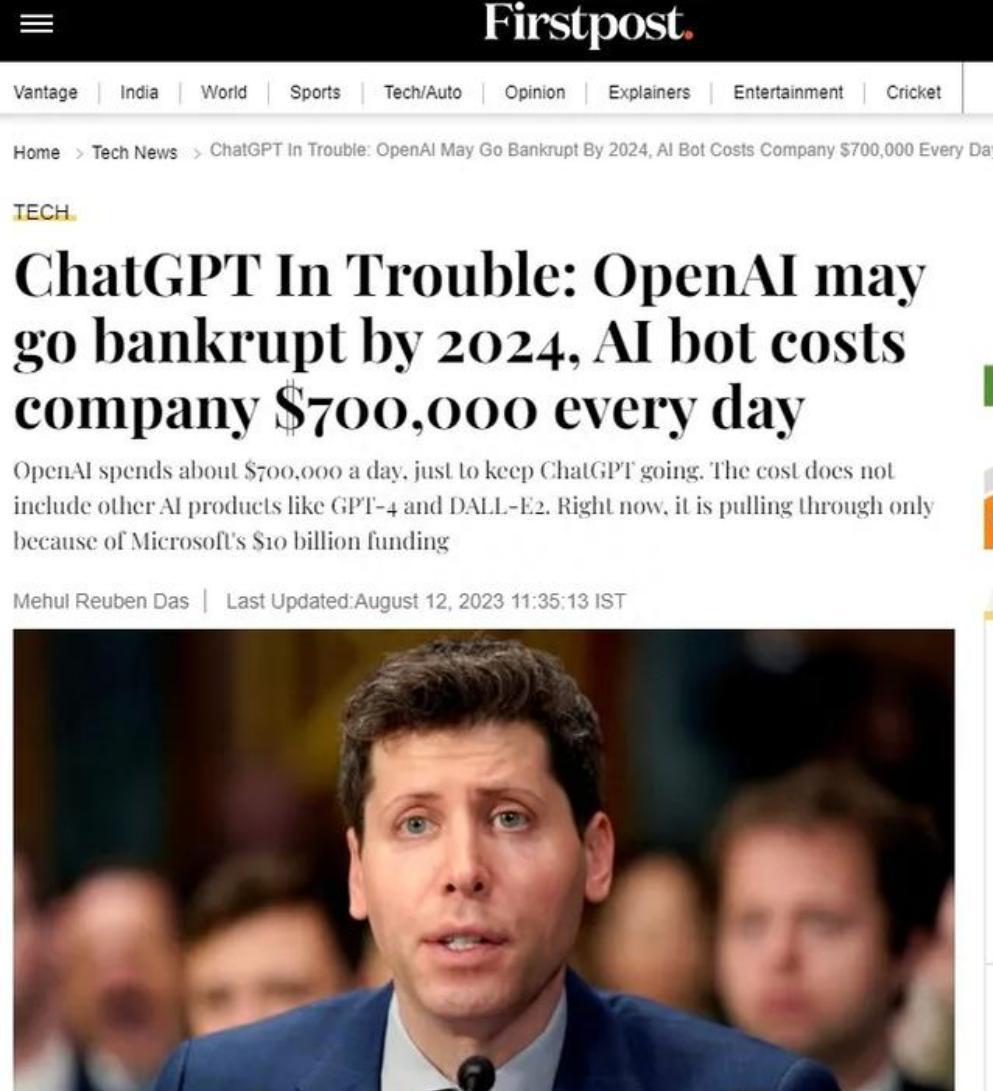 2023 年 1 月,投資銀行摩根士丹利的一份分析報告稱,在 ChatGPT 上回復的成本約為谷歌搜索查詢平均成本的 6 倍至 28 倍。根據(jù)摩根士丹利最近的分析,谷歌去年 3.3 萬億次搜索的平均成本約為每次 0.2 美分。因此可以看出,ChatGPT 聊天回復成本為 1.2 美分至 5.6 美分之間。根據(jù)公開的信息顯示,GPT4 一次完整的訓練大約需要 6000 多萬美元,報道所說的 ChatGPT 每天耗費 70 萬美元,應該主要是數(shù)據(jù)中心的日常算力消耗。僅在 2022 年 OpenAI 的財務凈虧損就高達 5.45 億美元。甚至有印度媒體聲稱 OpenAI 有在 2024 年倒閉的可能。