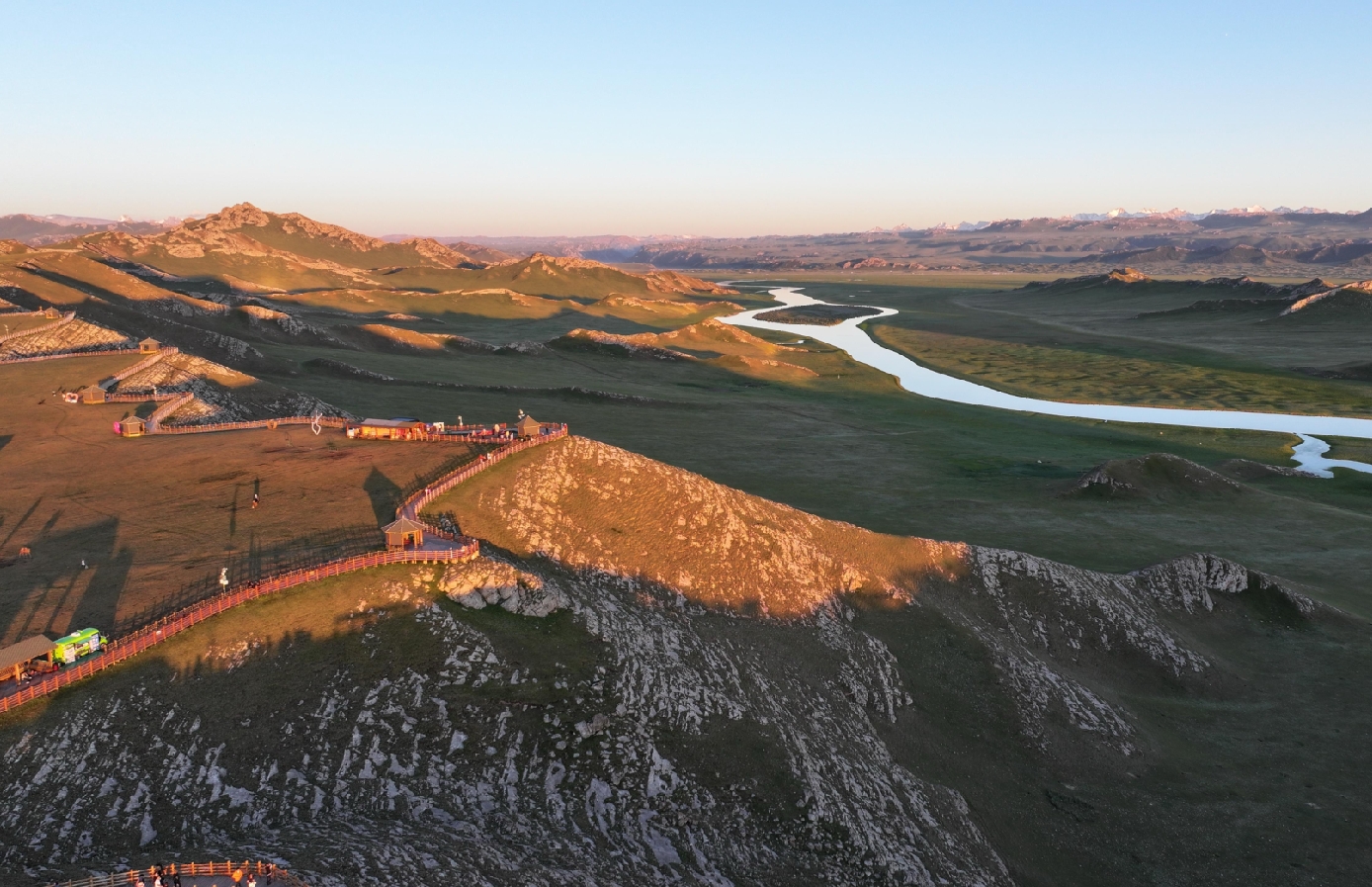 落日時(shí)分,巴音布魯克草原上的九曲十八彎景區(qū)。(王騫 攝)