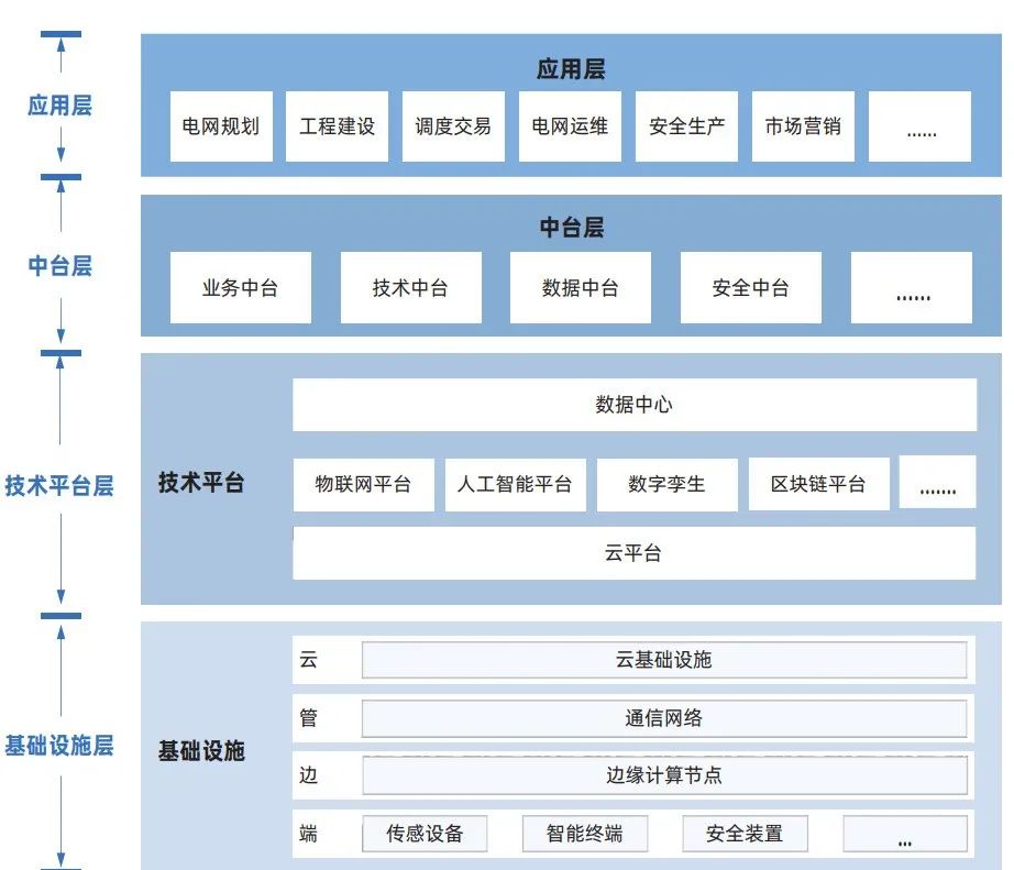 數(shù)字電網(wǎng)技術(shù)體系按照數(shù)字電網(wǎng)理論模型,由物理系統(tǒng)、信息系統(tǒng)、業(yè)務(wù)系統(tǒng)構(gòu)成。如下圖的三維立體結(jié)構(gòu)描述了數(shù)字電網(wǎng)技術(shù)體系架構(gòu),物理系統(tǒng)以發(fā)、輸、變、配、用為主線,業(yè)務(wù)系統(tǒng)分為電網(wǎng)規(guī)劃、工程建設(shè)、調(diào)度交易、電網(wǎng)運維、安全生產(chǎn)、市場營銷、人財物管理、黨政工團(tuán)等方面;信息系統(tǒng)包 括基礎(chǔ)設(shè)施層、技術(shù)平臺層、中臺層、應(yīng)用層。