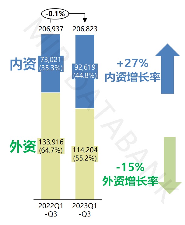 但我國(guó)近年來(lái)國(guó)產(chǎn)替代加速,導(dǎo)致內(nèi)資廠商市場(chǎng)份額不斷提升。據(jù)MIR睿工業(yè)數(shù)據(jù):2023年第三季度,國(guó)產(chǎn)工業(yè)機(jī)器人廠商扛住了壓力,同比增速達(dá)26.8%,遠(yuǎn)高于整體市場(chǎng)增速。且內(nèi)資廠商市場(chǎng)份額持續(xù)增加,占比提升至45%。