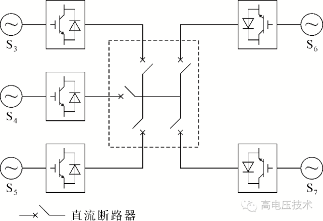 兩端VSC-HVDC系統(tǒng)拓?fù)浣Y(jié)構(gòu)較為簡(jiǎn)單,通過(guò)點(diǎn)對(duì)點(diǎn)的連接實(shí)現(xiàn)有功功率的傳輸。在兩端基礎(chǔ)上發(fā)展而來(lái)的多端柔性直流輸電系統(tǒng)(VSC-MTDC),能夠?qū)崿F(xiàn)多電源供電和多落點(diǎn)受電,可以采用不同的拓?fù)浣Y(jié)構(gòu)形成直流網(wǎng)絡(luò),極大地提高了直流輸電系統(tǒng)的操作靈活性和系統(tǒng)的可靠性。多端直流系統(tǒng)的拓?fù)淇梢苑譃榇?lián)型和并聯(lián)型,如下圖1-圖4所示,其中并聯(lián)型包括星形拓?fù)?、環(huán)形拓?fù)浜托切?中央環(huán)形拓?fù)涞取?/p>