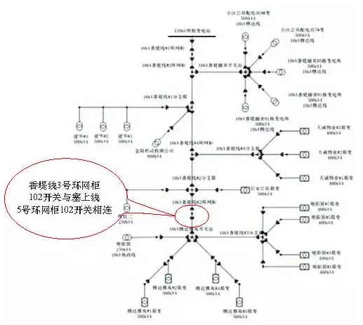 以示范區(qū)內(nèi)的10kV香堤線與塞上線為例,2條線路聯(lián)絡(luò)處的電網(wǎng)簡(jiǎn)化圖如圖5所示。