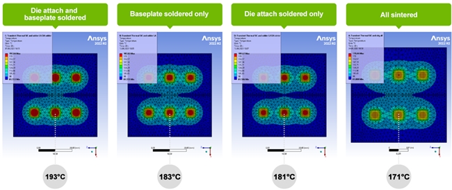 有關于同工況下,使用芯片下及系統(tǒng)級燒結銀連接方案,將會比單單在芯片下使用燒結銀方案,系統(tǒng)溫度將下降約10℃。比全軟焊料解決方案下降更多,能達到約20℃的顯著效果。
