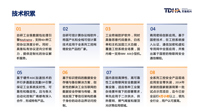 本次活動中,副總裁楊小帥更近一步向大家介紹了天地和興深厚的技術(shù)積累:自研工業(yè)級數(shù)據(jù)包處理引擎KeyEngine,支持40+種工控協(xié)議深度分析;自研可信計算協(xié)議棧軟件,是將國產(chǎn)化和全??尚庞嬎慵夹g(shù)應(yīng)用于全系列工控網(wǎng)絡(luò)安全產(chǎn)品的廠商;工業(yè)終端防護(hù)軟件,覆蓋工控系統(tǒng)全場景,還是國內(nèi)唯一支持IBM AIX小型機(jī);商用密碼創(chuàng)新應(yīng)用,并推出基于國密的物聯(lián)網(wǎng)安全通信模組;基于硬件ASIC加速技術(shù)的并行多通道全流量DPI引擎,保證工業(yè)系統(tǒng)實時性、可靠性和穩(wěn)定性;基于標(biāo)識密碼的數(shù)據(jù)安全存儲與備份解決方案,創(chuàng)新性的解決工業(yè)互聯(lián)網(wǎng)的數(shù)據(jù)安全存儲與傳輸;國內(nèi)首創(chuàng)高彈性、高可靠性工業(yè)物聯(lián)網(wǎng)安全數(shù)據(jù)采集設(shè)備,適應(yīng)各種工業(yè)復(fù)雜場景環(huán)境下的部署需求;全系列工控安全產(chǎn)品現(xiàn)場應(yīng)用安全零失誤,2014年承接的國家能源局第一批試點示范項目,迄今已安全運行8萬小時以上。