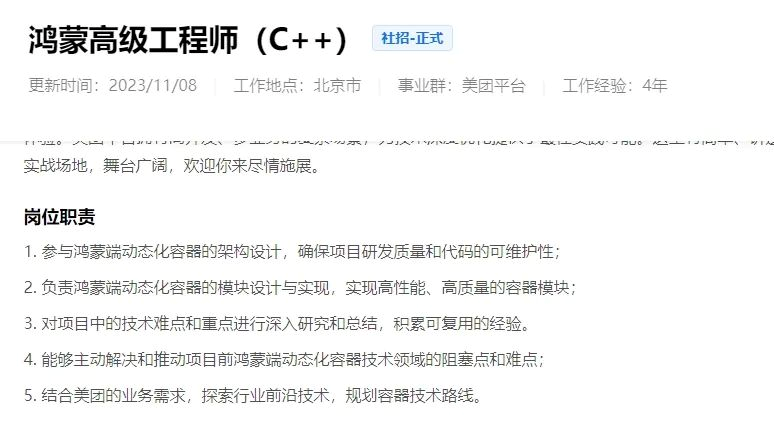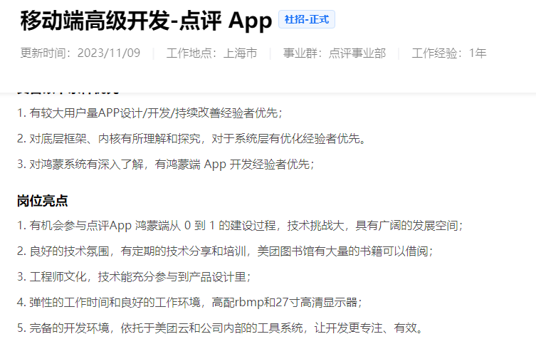 美團發(fā)布了鴻蒙高級工程師、鴻蒙基建工程師等多個鴻蒙開發(fā)相關崗位。主要開發(fā)美團鴻蒙App、大眾點評鴻蒙App。網(wǎng)易更新了高級/資深Android 開發(fā)工程師崗位,職位要求參與云音樂多端多OS的產(chǎn)品(Android、鴻蒙等)研發(fā)迭代。