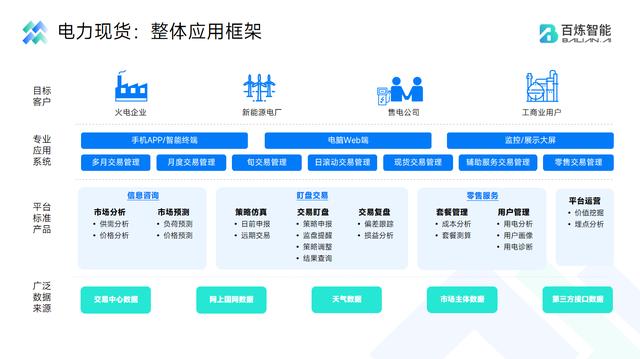 為了幫助發(fā)售電企業(yè)加速電力交易轉(zhuǎn)型,百煉智能基于先進(jìn)的AI及數(shù)據(jù)分析技術(shù)、系統(tǒng)開(kāi)發(fā)能力,自主研發(fā)“百煉智電”產(chǎn)品,為發(fā)售電企業(yè)建設(shè)一站式電力現(xiàn)貨市場(chǎng)交易及決策平臺(tái),強(qiáng)化企業(yè)管控水平、決策能力以及用戶服務(wù)能力,實(shí)現(xiàn)電力交易收益最大化。