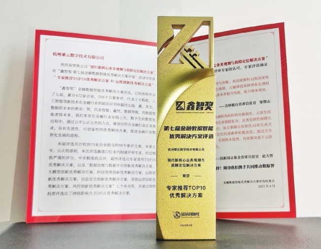 “鑫智獎(jiǎng)”作為金融數(shù)據(jù)智能領(lǐng)域的重要獎(jiǎng)項(xiàng),已連續(xù)舉辦七屆,致力于挖掘并推廣金融科技與數(shù)據(jù)智能深度融合的優(yōu)秀成果,彰顯數(shù)據(jù)智能在金融場景中的落地成效和未來潛力。2025年評(píng)選活動(dòng)共計(jì)收到來自70家企業(yè)的99個(gè)方案參評(píng),經(jīng)過27位專家評(píng)審與答辯打分,評(píng)選出專家推薦TOP10優(yōu)秀解決方案。乘云數(shù)字此次獲獎(jiǎng)的“專家推薦TOP10優(yōu)秀解決方案”,圍繞國內(nèi)銀行新一代核心系統(tǒng)的復(fù)雜性面臨的全新運(yùn)行穩(wěn)定性挑戰(zhàn),在快速的發(fā)現(xiàn)問題、定位問題、處理問題及大模型新技術(shù)的應(yīng)用等方面展現(xiàn)出專業(yè)、系統(tǒng)的技術(shù)優(yōu)勢,獲得專家組高度認(rèn)可。