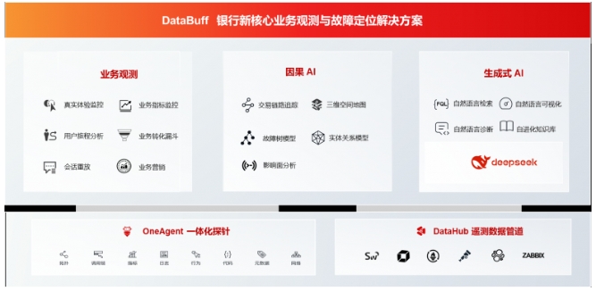 銀行新一代核心的復(fù)雜性帶來了全新的運(yùn)行穩(wěn)定性挑戰(zhàn),傳統(tǒng)監(jiān)控技術(shù)面臨嚴(yán)重瓶頸。DataBuff一體化觀測平臺(tái),通過創(chuàng)新的方式將“業(yè)務(wù)觀測”、“因果AI”、“生成式AI” 三大領(lǐng)先技術(shù)深度融合,幫助銀行全面解決新一代核心系統(tǒng)的運(yùn)行穩(wěn)定性問題。該平臺(tái)能夠深度感知新一代核心的業(yè)務(wù)運(yùn)行狀態(tài),全面梳理消費(fèi)者的業(yè)務(wù)旅程,構(gòu)建“以業(yè)務(wù)為中心”的新一代監(jiān)控管理體系,提供端到端的交易級(jí)鏈路追蹤能力,快速發(fā)現(xiàn)問題、定位問題、處理問題,實(shí)現(xiàn)故障定位的一鍵直達(dá)。