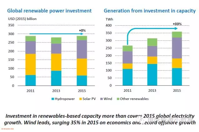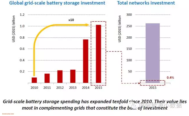特別值得一提的是,2011年以來全球在可再生能源發(fā)電投資基本平穩(wěn),但是由于可再生能源成本的下降,每年新增的可再生能源發(fā)電量逐年增加,2015年超出2011年33%。此外,電力儲能投資2015年超過100億美元,是2010年的10倍;但是儲能投資僅占電網(wǎng)投資的0.4%,還有很長的路要走。