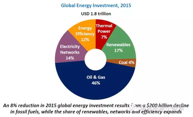 雖說油氣投資大幅下降,但是在全球1.83萬億的能源投資總額中,油氣投資占比達(dá)到46%??稍偕茉赐顿Y占17%;火電發(fā)電廠投資占7%,電力輸配網(wǎng)投資占14%;能效投資占12%;煤炭開采和運輸投資僅占4%。
