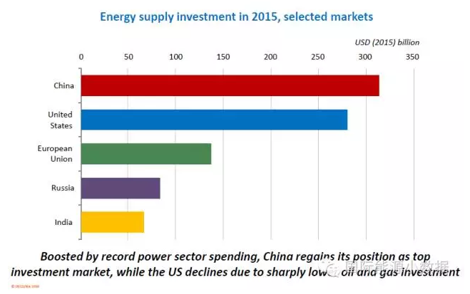 2015年中國能源領(lǐng)域總投資為3150億美元,占全球能源總投資的17%,是世界上第一能源投資大國,遠(yuǎn)超位居第二的美國(2800億美元)。在中國能源投資中,有900億美元用于可再生能源發(fā)電;450億美元用于化石能源電廠(主要是煤電廠,2015年新增煤電裝機接近45吉瓦)。