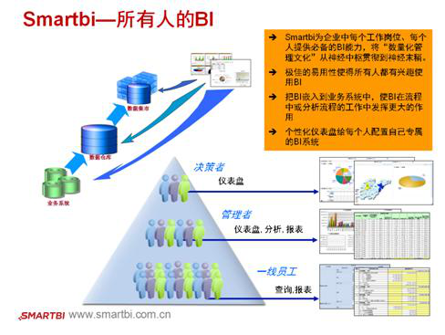 數(shù)據(jù)應用即為數(shù)據(jù)的應用、交換與服務,需要通過思邁特軟件Smartbi等可視化的途徑直接服務于企業(yè)的一線生產人員、監(jiān)管人員、業(yè)務負責人、公司高層以及企業(yè)董事。