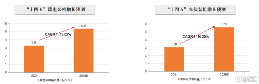 一方面,在“雙碳”目標(biāo)下,新能源裝機(jī)量有望持續(xù)增長(zhǎng),尤其是風(fēng)電、光伏領(lǐng)域。根據(jù)全球能源互聯(lián)網(wǎng)發(fā)展合作組織預(yù)測(cè),到2025年,我國(guó)清潔能源裝機(jī)量將達(dá)到17億千瓦,其中風(fēng)電裝機(jī)容量將達(dá)到5.36億千瓦,2021-2025年CAGR達(dá)13%;光伏裝機(jī)容量將達(dá)到5.59億千瓦,2021-2025年CAGR達(dá)16.26%。