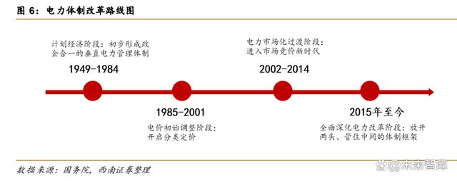 從我國(guó)電價(jià)政策機(jī)制發(fā)展歷程來(lái)看,我國(guó)電價(jià)政策機(jī)制發(fā)展歷程大致可以分成四個(gè)階段: 1)計(jì)劃經(jīng)濟(jì)階段(1949-1984 年):1950 年,我國(guó)成立電力行業(yè)管理局,初步形成以中央 領(lǐng)導(dǎo)為主、地方領(lǐng)導(dǎo)為補(bǔ)充的政企合一的垂直電力管理體制;2)電價(jià)初始調(diào)整階段 (1985-2001 年):1985 年,以國(guó)家經(jīng)濟(jì)委員會(huì)、國(guó)家計(jì)劃委員會(huì)、水利電力部、國(guó)家物價(jià) 局發(fā)布的《關(guān)于鼓勵(lì)集資辦電和實(shí)行多種電價(jià)的暫行規(guī)定》為標(biāo)志,開啟分類定價(jià);3)電力 市場(chǎng)化過(guò)渡階段(2002-2014 年):2002 年國(guó)務(wù)院發(fā)布《電力體制改革方案》,標(biāo)志著我國(guó) 電力行業(yè)定價(jià)正式告別政府定價(jià),進(jìn)入市場(chǎng)競(jìng)價(jià)新時(shí)代。4)全面深化電力改革階段(2015 年至今):2015 年,中共中央國(guó)務(wù)院下發(fā)《關(guān)于進(jìn)一步深化電力體制改革的若干意見(jiàn)》(中發(fā) [2015]9 號(hào)),確定了“三放開、一獨(dú)立、三強(qiáng)化"的改革基本路徑以及"放開兩頭、管住中間" 的體制框架。 新一輪電力體制改革加速推進(jìn)。傳統(tǒng)電力系統(tǒng)調(diào)度模式為“源隨荷動(dòng)”,根據(jù)用電側(cè)來(lái) 調(diào)整電源側(cè)的發(fā)電量,新型電力系統(tǒng)下電源側(cè)發(fā)電量和負(fù)荷側(cè)用電量均不可控,加大了電力 調(diào)度難度。而目前電網(wǎng)調(diào)度方式主要是面向常規(guī)電源為主的計(jì)劃調(diào)度機(jī)制,電力體制改革隨 之深化。